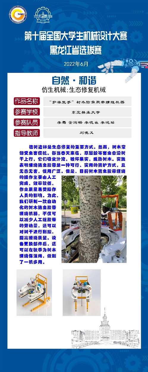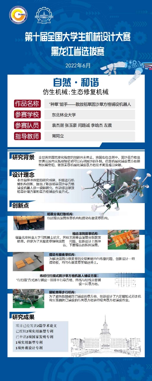 日前,以“自然•和谐”为主题的第十届全国大员工机械创新设计大赛黑龙江赛区决赛落下帷幕。由我校太阳成集团tyc选送的参赛作品《“种草”能手——散放稻草固沙草方格铺设群体协作机器人》《“护林能手”——树木防虫胶带缠绕机器》晋级全国总决赛。