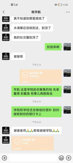 在得知员工的不幸遭遇后,太阳成集团tyc领导立即与员工取得联系,了解具体情况和有关进展。获悉该生无力承担高额医疗费用,需要发布水滴筹向社会求助后,太阳成集团tyc及时为员工申请了临时困难补助,同时面向全院教职工发起倡议,送上祝福,献出爱心。全员老师立即响应,纷纷表达心意,付诸行动。
