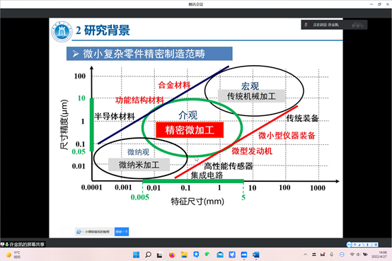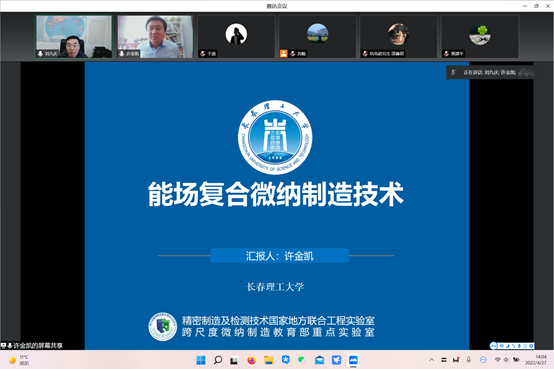 许金凯教授介绍了长春理工大学跨尺度微纳制造教育部重点实验室基本情况,其研究方向主要面向四大方面:跨尺度微纳机械制造、跨尺度微纳特种加工、跨尺度微纳操纵与制造和超精密传感与测试等,聚焦上述四个面向、围绕毫微米级尺度、纳米级表面极端制造开展研究。许教授着重介绍了微小复杂零件精密制造领域所面临的问题,主要包括微小零件精密/超精密加工技术研究,探索微切削“极限加工质量”;微小复杂结构件能场复合微细加工技术,解决“高温复材难加工、深/薄零件难控形、极小尺寸难实现”三大制造难题;大面积金属功能表面微细加工技术及应用,实现微细加工技术在“大面积金属功能表面制造”上的拓展应用。