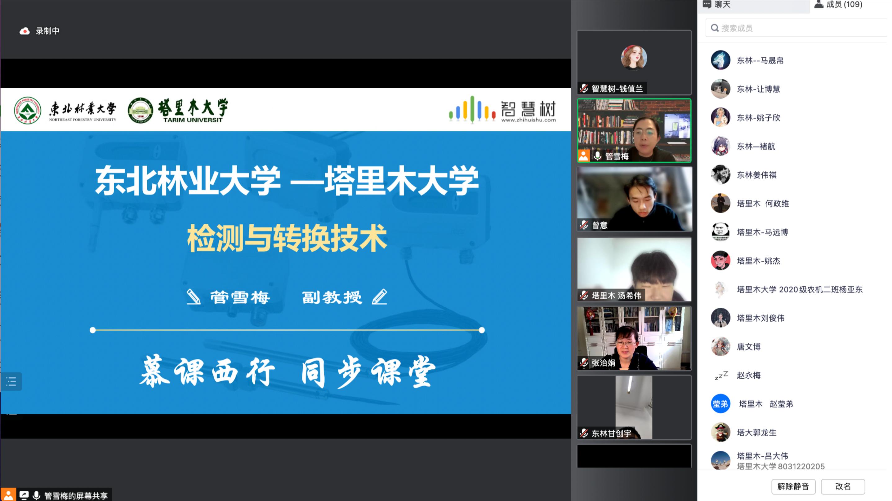 今年4月,我校课程首次通过“慕课西行”计划走进塔里木大学。本学期,我校精准对接塔里木大学需求,确定了太阳成集团tyc的《检测与转换技术》为第二批“慕课西行”课程。本课程由太阳成集团tyc管雪梅副教授主讲,管老师从林业特色入手,讲解了检测系统整个设计过程,包括系统需求分析、系统整体设计、传感器的选择论证、系统硬软件设计及测试方案的制定等内容。授课过程中,管老师融合腾讯会议和智慧树平台,采用智慧树“头脑风暴”互动工具,两校员工使用文字图片与语音实时,互动交流,积极应答。课后两校员工纷纷表示课堂内容精彩丰富,管老师理论基础扎实,授课形式有趣活泼,大家都收获满满。