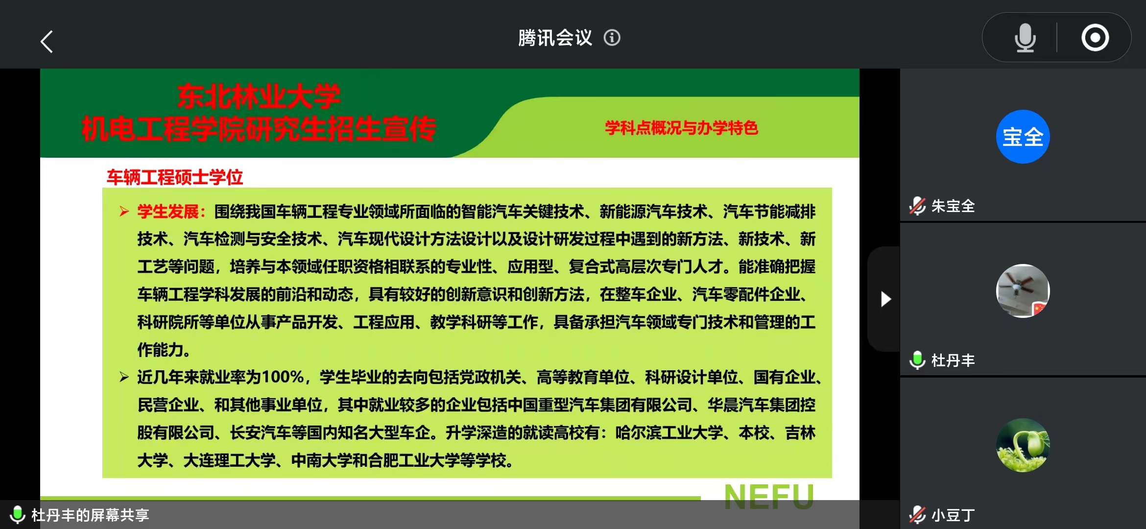 车辆工程专业学位负责人杜丹丰教授介绍了专业和学科的历史沿革、专业学位和学术学位学科设置情况、培养目标、课程设置、办学条件及师资力量等情况,介绍了专业相关校外实习基地,专业特色等信息,尤其强调了专业硕士培养要面向社会、面向企业、面向先进技术。