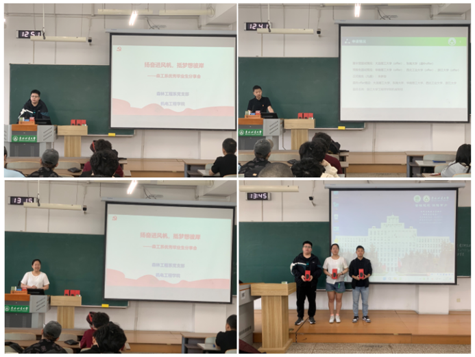 与会同学与优秀毕业生代表进行了积极的交流,不仅明确了自身努力的方向,也从优秀毕业生身上学到了坚持梦想、抵达梦想彼岸的方法和经验。辛颖为三位优秀毕业生代表送出森工专业教工党支部的祝福,祝愿同学们“不忘初心、不忘东林、梦想与成功伴随‘一杯子’。