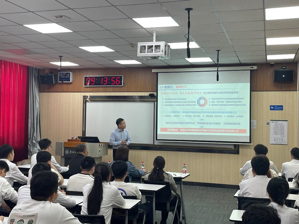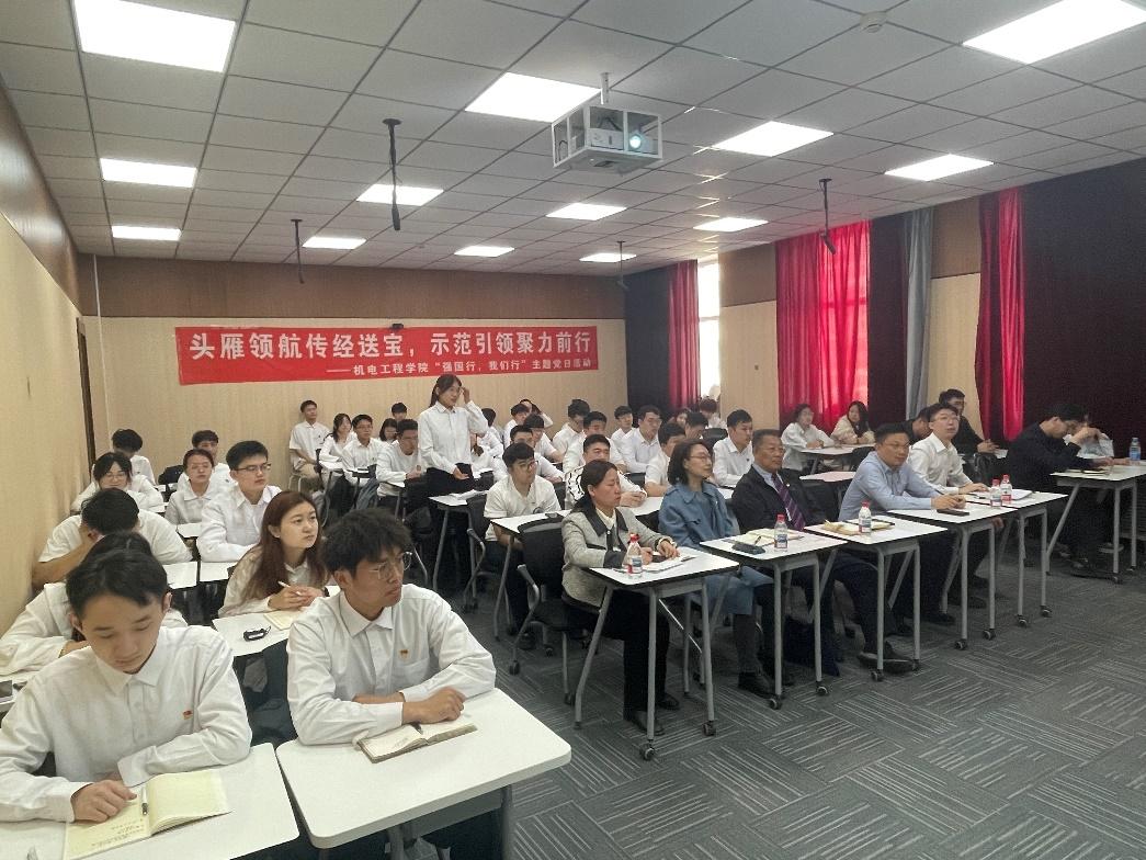 王佳彤简要介绍了举办此次主题党日活动的特殊背景:一是时间节点特殊。恰逢“五一”国际劳动节、五四青年节来临,统筹国内经济工作和国际经贸斗争,深入贯彻中央八项规定精神,落实《教育强国建设规划纲要(2024—2035年)》,筹备召开学校第十四次党代会,迎接本科教育教学审核评估的关键时期。二是参加人员特殊。既有经验丰富、德高望重的教育部党建联络员列席,也有党员领导干部、员工党员、员工党员、入党积极分子各层面代表。三是活动内容特殊。“强国行”专项行动团队负责人、全省高校样板党支部书记、全省优秀教育工作者联袂上台,共话成长、进步、思考,互学互鉴、互联互促。希望大家认真聆听,深入学习,广泛交流,为实现以高质量党建引领高质量发展的机电党建工作贡献力量。
