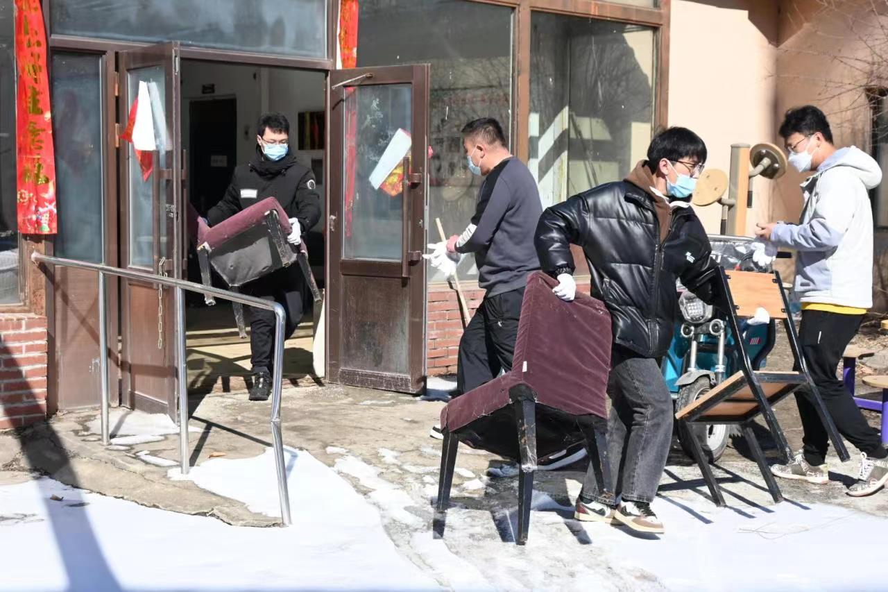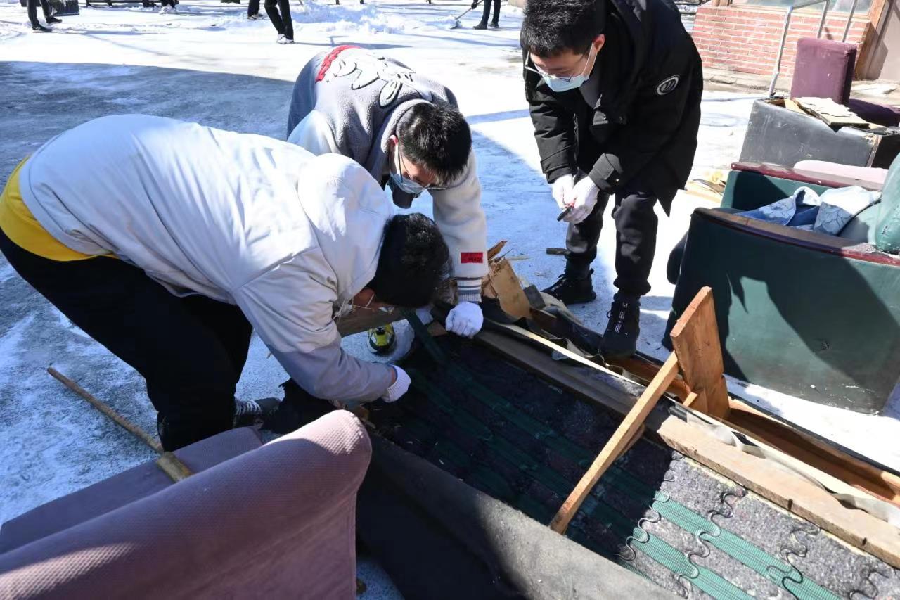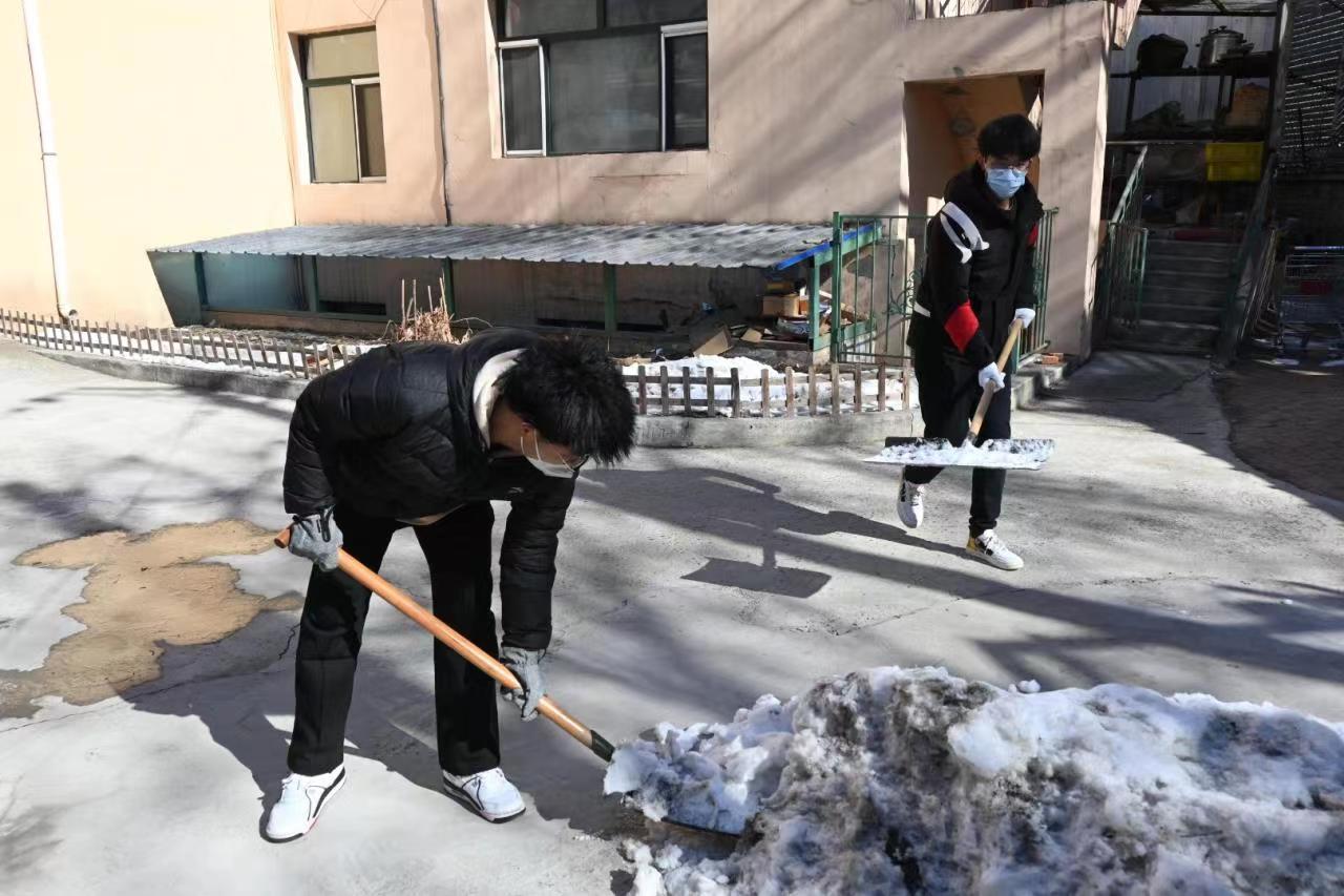 大家带着准备好的清雪工具,分成两组,协同作战,耐心细致地把前院和后院的积雪一点一点清理干净,尤其是背阴的地方结成薄冰,不容易化掉,同学们就一锹一锹地把冰块捣碎,以防老人踩空滑到。考虑到院子里的积雪没有撒融雪剂,同学们还把部分清理出来的雪堆在树坑和绿化带中,为树木补充水分。清雪任务完成后,大家又帮助公寓管理人员,把因为疫情停止使用三年的“阳光活动室”里的杂物垃圾清理出来,将所有桌椅擦拭干净、摆放整齐,让活动室“重见阳光”。“没有雪了,老人们就可以出来活动了,看着干净的院子,心情也干净”,支部成员戚叶亮同学边擦汗边说到。