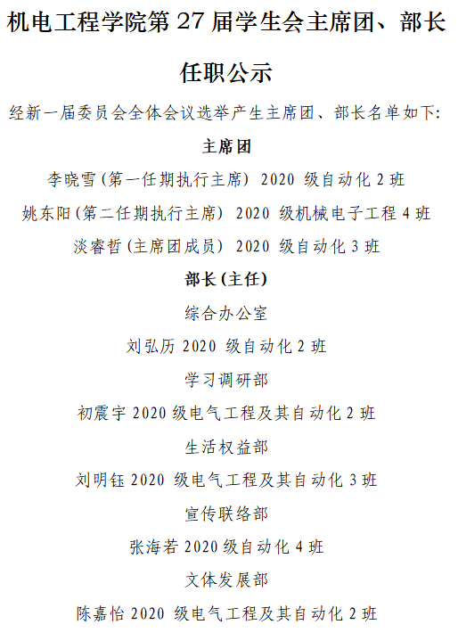 经投票,李晓雪、淡睿哲、姚东阳3名同学当选为新一届员工会主席团成员;潘阔、王雨晨、李晓雪等24名同学当选太阳成集团tyc第二十七届员工委员会委员。
