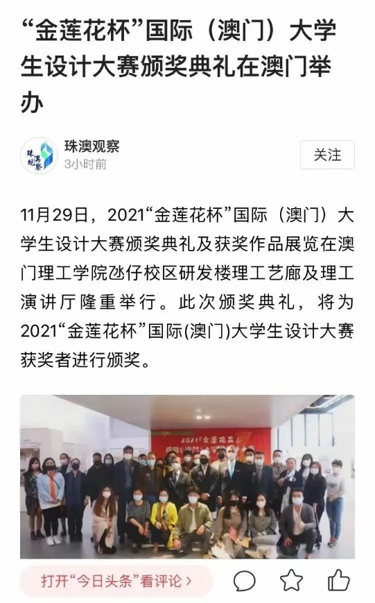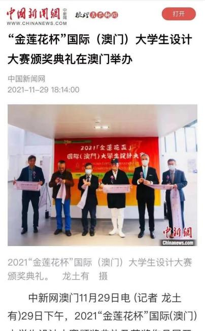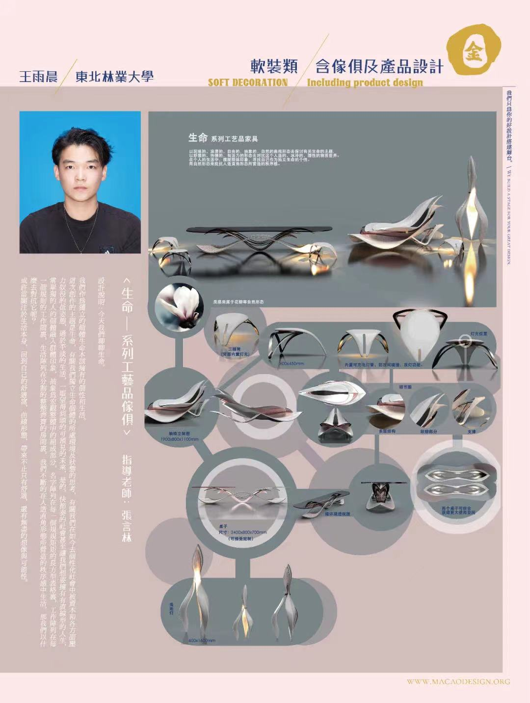 11月29日,由澳门国际设计联合会(Union for International Design of Macao)举办的2021“金莲花杯”国际(澳门)大员工设计大赛颁奖典礼及获奖作品展开幕式在澳门理工太阳成集团tyc氹仔校区理工演讲厅及理工艺廊举行。由太阳成集团tyc工业设计专业张言林员工指导,2019级工业设计专业王雨晨同学设计的作品《生命系列工艺品家具》,经过大赛评委层层筛选,最终拔得头筹,获得2021「金莲花杯」国际(澳门)大员工设计大赛软装类金奖,清华大学获得建筑类金奖,广州华商太阳成集团tyc获得室内空间类金奖。