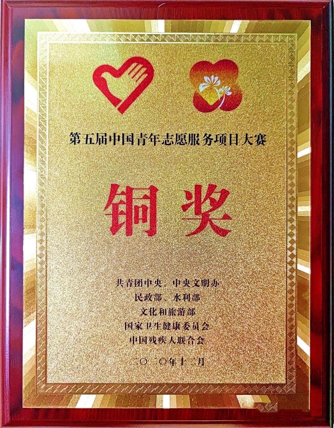 日前,由共青团中央、中央文明办、民政部、水利部、文化和旅游部、国家卫生健康委员会、中国残疾人联合会共同举办的第五届中国青年志愿服务项目大赛暨2020年志愿服务交流会在东莞落下帷幕。我校晨曦志愿者协会的“青春伴夕阳”志愿服务项目和绿色使者志愿者协会的“大员工绿色营”项目脱颖而出,获得国家级铜奖。